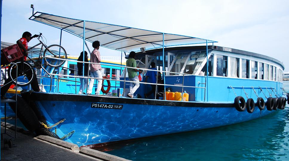 由首都馬里乘公共渡輪往Maafushi 居民島大約1個半小時航程,除星期五外,每天下午3時由馬里的Villingili Ferry Terminal開出,而逢星期二、四、日早上10時亦另有多一班次。