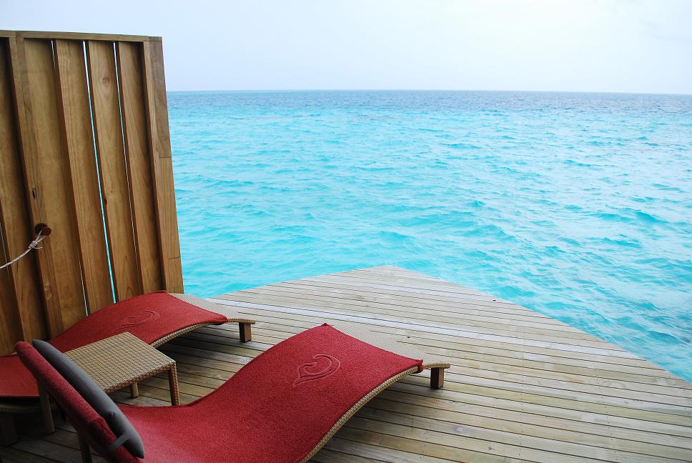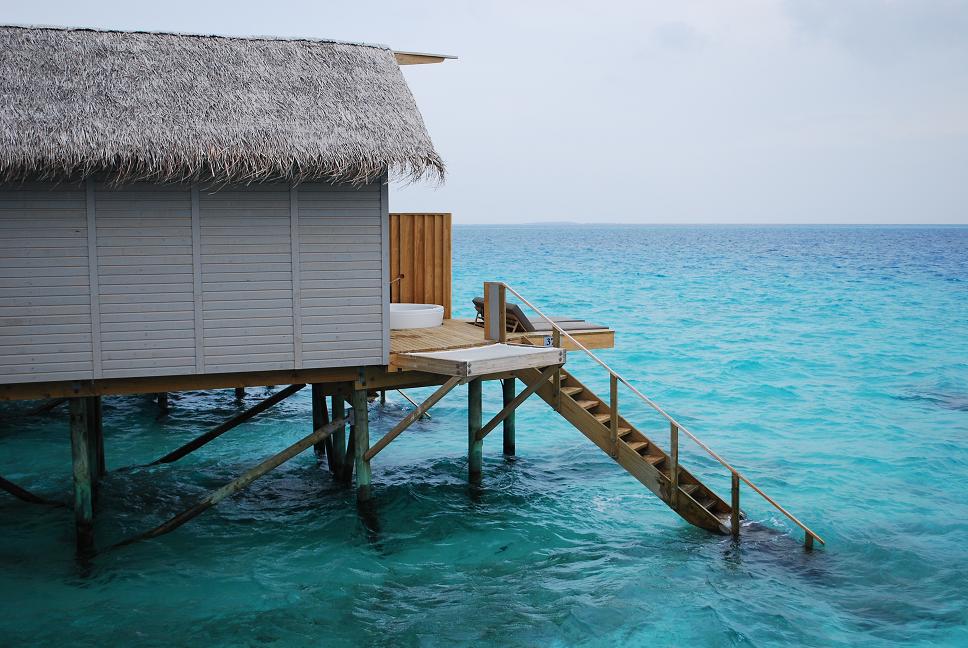 酒店的水上屋共有兩款:Deluxe Water Villa (42坪方米)及Premium Sunset Spa Water Villa (42坪方米),兩者的sundesk各擁兩張沙灘椅及直通印度洋的木梯,唯Premium Sunset Spa Water Villa多了一個按摩浴缸及網床,兩者同樣設計簡約,但當然要預期房間面積比較細小。