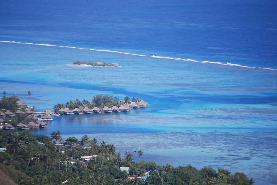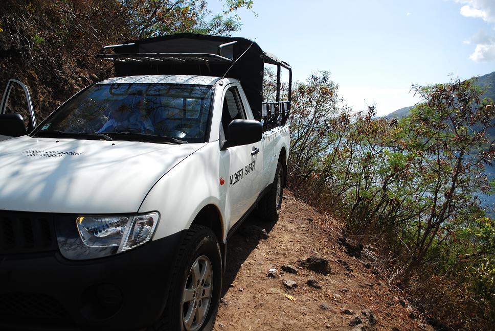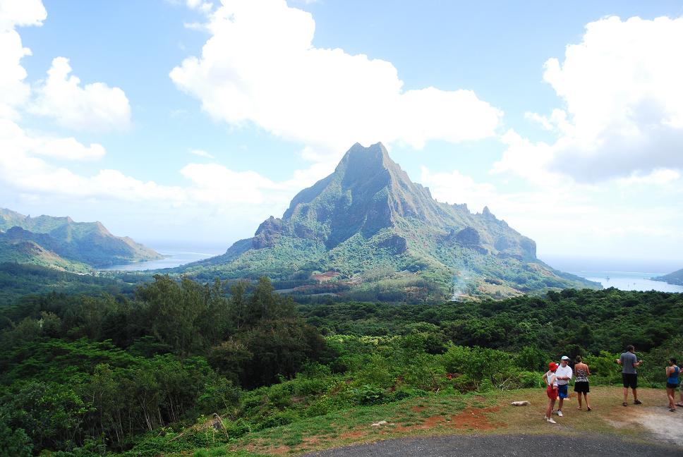 Albert Safari 的司機兼導遊比預定時間早到我入住的酒店,我們首先前往被稱之為 Magic Mountain 的 Mouatoro 上在高空飽覽 Moorea 的美景,四驅車行駛在崎嶇顛簸的山路上,導遊卻揮灑自如地控制,在山頂上左邊遙望 InterContinental Moorea 酒店,而右手邊是 Hilton Moorea,景色美不勝收。