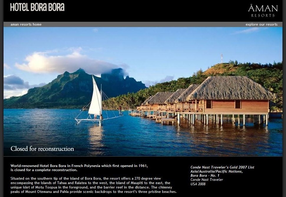 Aman Resorts 官網 2008年開始至今仍顯示 Hotel Bora Bora《Closed for reconstruction》