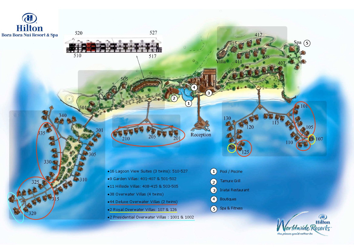 整間酒店只有七個房間可以擁有山景,分别是六間 Deluxe Overwater Villa (房號101-106)及 一間 Royal Overwater Villa (房號107),其實最基本的 Overwater Villa 與及高一級别的 Deluxe Overwater Villa 房間設計完全相同,只是普通 Overwater Villa 的景觀較差,例如會看到其他房間或面向酒店的公共設施等,私隱度較低,但是在我而言,我並不太著重私隱、亦不太介意會望到其他房間,所以基本的 Overwater Villa 對我來說已經大致上可以了,但是在這裡我喝望能擁有山景,因此我便訂了 Deluxe Overwater Villa,並去信酒店要求安排 104-106 號房,由於希望方便拍照,所以最底線是至少能安排1字開始那邊的房號,因為那邊是整間酒店拍攝 Mount Otemanu 的最佳位置,但可惜的是最後只能安排到距離頗遠的330號房間,但也總好過2字開始的房號,因為感覺房間大近岸了,而且好像左右都被夾擊似的。