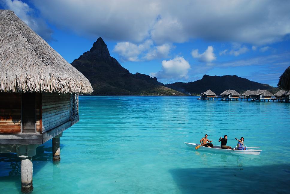 由於地理環境因素,每天只有中午前的光線才適合拍攝以 Mount Otemanu 作背景的照片,剛巧酒店職員送獨木舟早餐到住客房間內,並循例載住客在水上屋附近遊一圈,按下快門一刻他們三位的姿勢完美無瑕,整幅畫面擁有 Bora Bora 所有最重要元素:水上屋、Mount Otemanu、獨木舟和蜜月情侶,這幀相片或許是多年來最滿意的一張。