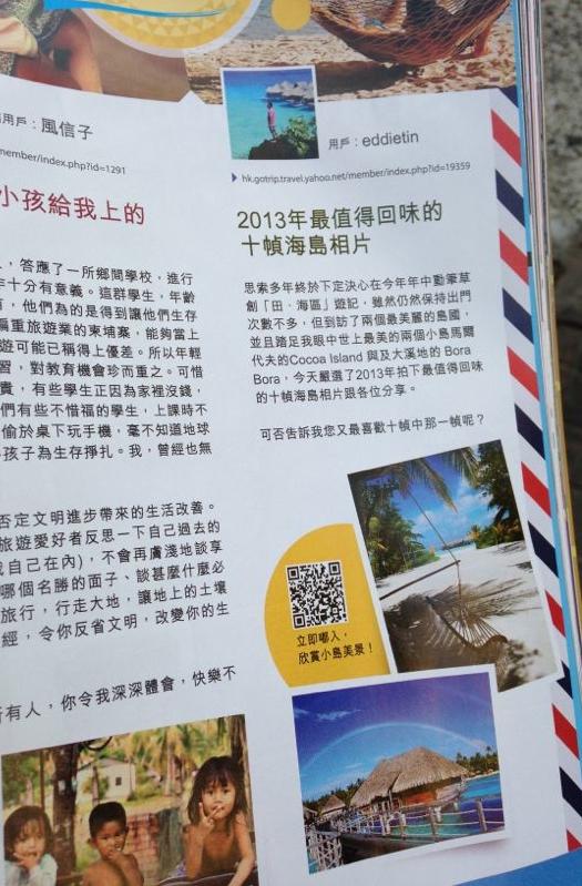 版主上月發佈的一篇「2013年最值得回味的十幀海島相片」刊登於今天提早出版的香港雜誌「新Monday」週刊之Yahoo!旅遊 GOtrip旅遊版內,有興趣的朋友可買本看看。
