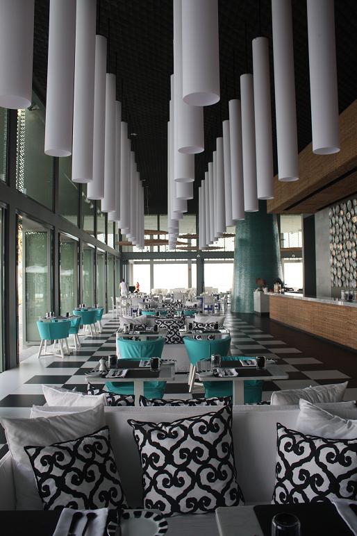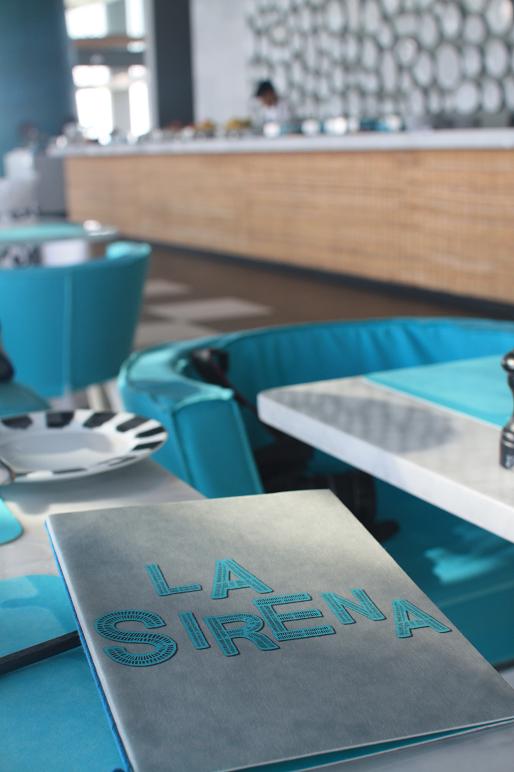 另一間是意大利餐廳 (La Sirena),提供早、午、晚餐,Paola 設計意大利餐廳時很著重自然光,她用上了全落地玻璃接門設計,在早上用餐時職員會將它們完全開啓,讓自然的日光直接射入餐廳內,微微的海風浸透每一位客人身上,在這樣舒適的環境享用早餐,我總可以慢慢消磨兩個小時才肯離開。Paola 對餐廳餐桌上的桌巾顏色的執著更可突顯出她的一絲不拘,在早上客人用餐時,餐廳會以湖水藍色的桌巾,將天上的藍天,泳池給太陽照射下的藍與餐廳的桌巾顯得很相配;但到晚上,因為湖水藍色的桌巾與外間的黑夜不再相配 ,故此Paola 會選用上黑色的桌巾代替。