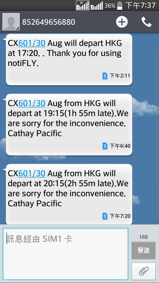 等待到大約晚上七時,我又再次重返登機閘口,大批乘客聚集在地勤職員的櫃台前,原來航班又再一次延誤到晚上8時15分,即是代表航班比原定時間延誤兩小時五十五分鐘,由於原定的航機不能飛,我們需要換另一班客機,登機閘口亦要換。約晚上8時30分乘客終於可以登機,即使航班已經準備就緒,但我們還要等待祖國獻給我們的航空交通管制,空管就如病毒一樣,由最初香港至上海/北京航線逐漸蔓延至其他航線,由於國內航道緊張,加上航班數量越加越多,引致今年上半年國泰及港龍航班延誤問題十年來最嚴重,僅七成航班在原定時間十五分鐘內出發或抵埗,恐怕延誤問題將會有增無減。