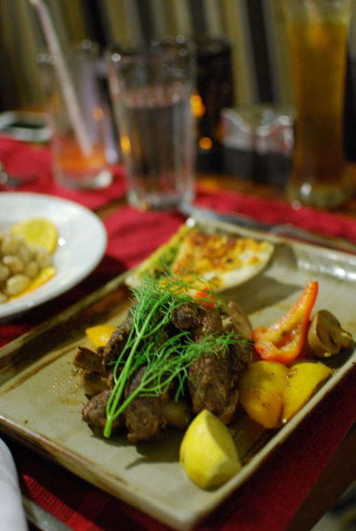 點餐時為安全計我們不選牛、羊及魚,我選了一個雞肉串配扒蔬菜和洋薊沙拉(Chicken Kofta),朋友則選了無骨雞肉配扒蔬菜和烤土豆(Grilled Boneless Chicken)再加一個前菜鷹嘴豆拌大蒜、奶酪汁配香脆面包粒(Al Khaimah Fatteh)。前菜的鷹嘴豆先上桌,同伴說吃下去沒什麼特別,但亦沒有太奇怪的味道,就只是豆味,但我頗愛吃鷹嘴豆的,她就不怎欣賞,留下我通通將整盤幹掉。接著是萬眾其待的主菜上桌,朋友的雞排好大一塊,看似沒有異樣,她戰戰兢兢放一小塊到口中,味道竟然是出乎我意料之外,她說簡直好吃到不得了啊!沾上燒烤醬完全停不了口,選這個完全沒有錯,只是稍為油膩了一點。而我的雞肉串則較遜色,肉質烤得較乾,份量不多,有輕微的羶味,雖然味道還合格,但比起朋友那份無骨雞肉卻完全比下去。吃完主菜已經飽到吃不下甜品了,不過沒關係,同伴說主菜那麼美味已經很滿足。還有要推薦一下只有這間餐廳獨有的特飲Arnold Palmer (Ice tea and lemonade),味道像有氣的檸檬茶,其他餐廳都沒有供應,我很喜歡它的味道。